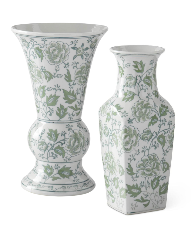 Green & White Ceramic Chinoiserie Bud Vases