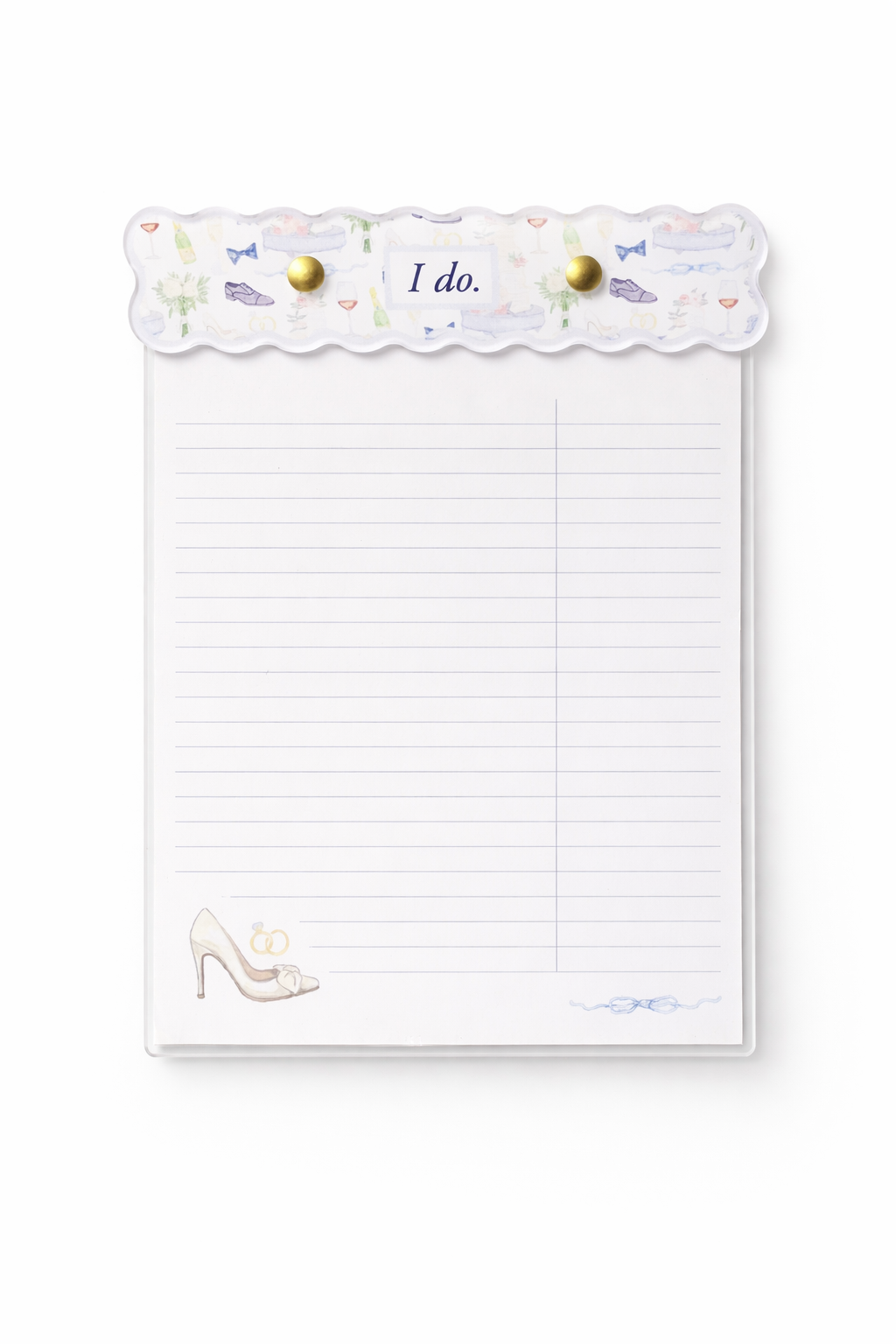 I Do Acrylic Notepad – a charming 6x8 print mounted on sleek acrylic that brings a touch of whimsy to any desk or shelf. Perfect for jotting down wedding plans, love notes, or daily reminders with a smile. This cute keepsake doubles as décor, combining functionality with heartfelt style. Whether you're celebrating an engagement, planning the big day, or gifting to the couple who has everything, this playful piece adds personality and purpose to your space.
