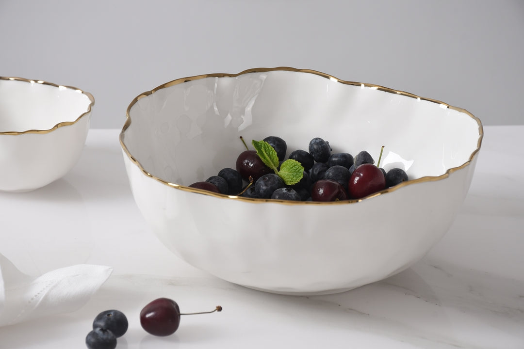 Medium Bowl in Portofino. Great for individual serving of pasta, salad or chips. Gorgeous white porcelain with a delicate gold trim. Food safe, tarnish free, dishwasher safe, oven safe to 500°. Easy Care.